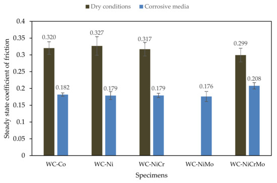 Steady state coefficient of friction values for the four specimens (WC-Co, WC-Ni, WC-NiCr, WC-NiMo, and WC-NiCrMo) for a normal load of 23 N in dry/unlubricated and in the presence of the corrosive media/lubricated conditions.
