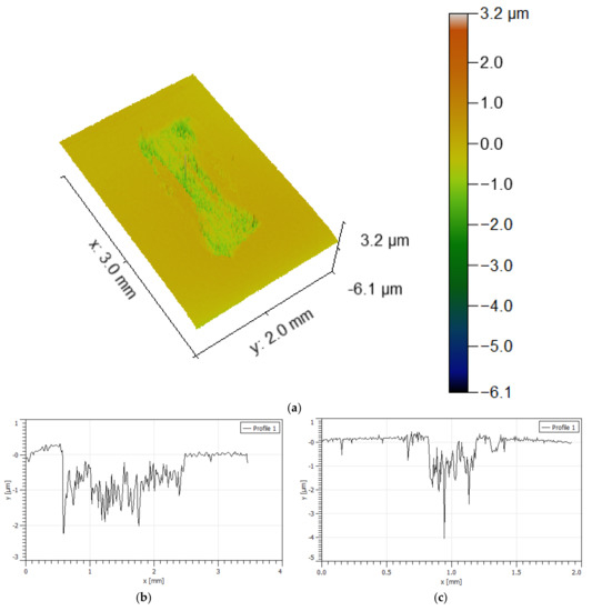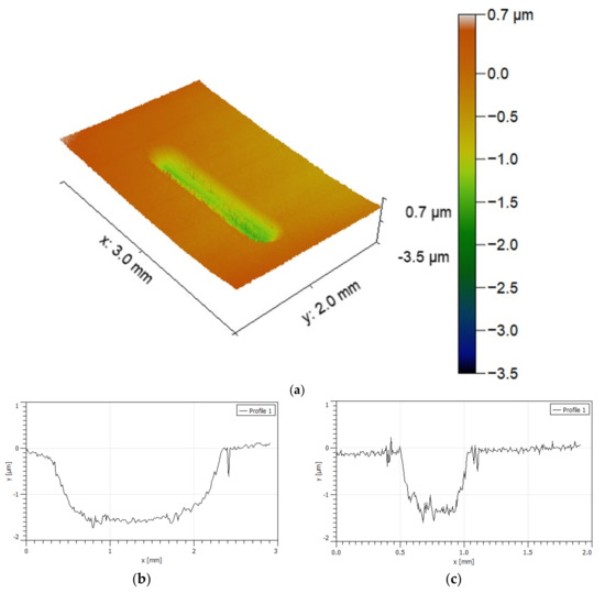 Profiles of the wear track for the WC-Co specimen rubbing against a zirconia ball in a 0.5 M NaCl + 0.05 M HCl solution (lubricated), the severity of 8500 N.m and 3 Hz of frequency: (a) 3D profile, (b) longitudinal profile, and (c) transversal profile.
