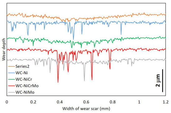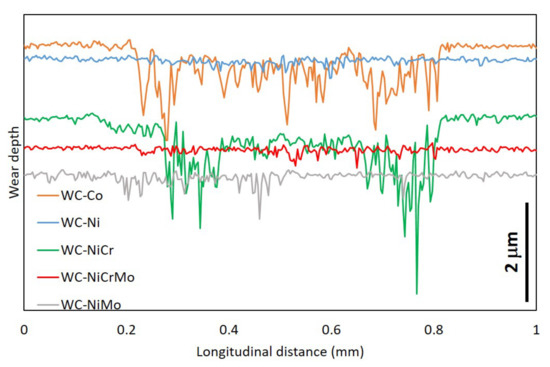 As shown in Figure 10, the wear track is barely visible, with only minor depth fluctuations registered for WC-Ni, WC-NiM,o and WC-NiCrMo specimens. On the other hand, as described above, for the WC-Co and WC-NiCr specimens, wear can be observed in higher depth at the ends of the wear track.