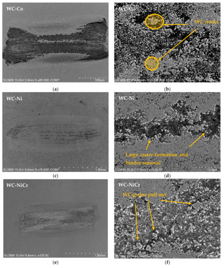 Furthermore, WC grains are unsupported and fracture more readily or can be removed/pulled out. The micrographs shown in Figure 12 corroborate this behaviour. Notably, the WC-Co composite (Figure 12a,b) has a more damaged surface than the remaining Ni-based hardmetals.