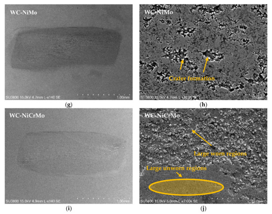 SEM micrographs of the wear tracks for the five different specimens for 17 N applied load, showing the wear mechanisms: (a,b) WC-Co, (c,d) WC-Ni, (e,f) WC-NiCr, (g,h) WC-NiMo, and (i,j) WC-NiCrMo.