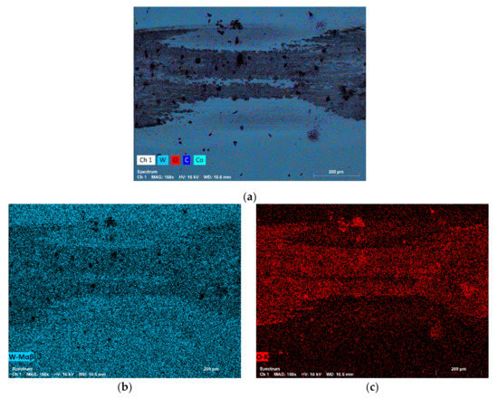 Figure 13 shows an SEM-EDS mapping for the WC-Co specimen after the tribocorrosion test under a 17 N normal load, 41,667 s sliding time, and 3 Hz frequency in an acidic solution of 0.5 M NaCl + 0.05 M HCl. It is possible to observe that an oxide layer was preferentially formed at the specific zones where the binder dissolution and/or binder removal occurred. Most likely, after the removal/dissolution of the binder, the WC grains underwent an oxidation process [30,31], as evidenced by the intense red colour in the eroded region shown in Figure 13a,c. Thus, the formation of these W oxides could also reduce the wear on samples’ surfaces.