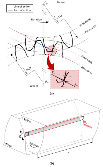 where L is the length of the rectangular contact strip (assumed to be the width of the tooth flank along the line of action) and a is the contact semi-half-width (Figure 1):