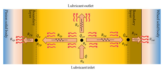 For highly loaded EHL contacts a combination of thin lubricant film and low lubricant flow rate through the contact means that the rate of convective heat transfer, , is almost negligible [14,56]. Most of the heat is conducted away through the bounding contacting solids (i.e., the meshing teeth). However, convective heat transfer through lubricant flow is retained for the sake of completeness of the analysis: