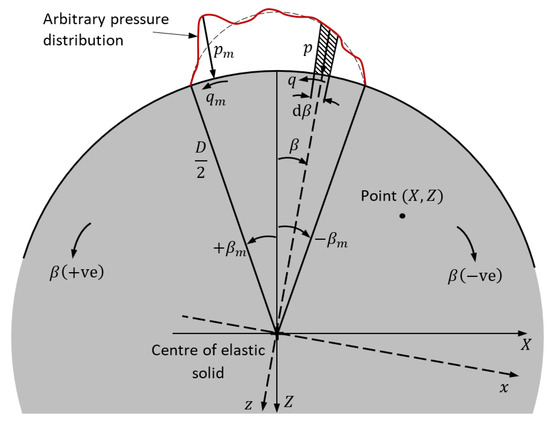 Johns-Rahnejat et al. [34] provided an analytical generic solution for sub-surface stresses generated in an elastic solid under a parabolic pressure distribution. However, EHL contact pressure distribution does not follow a simple analytical expression. Johns-Rahnejat et al. [34] spread the arbitrary pressure distribution over the contacting face of an elastic solid of revolution approximated by a parabola, as shown in Figure 4. Here, the solid of revolution is a long roller, representing an instantaneous geometry of a gear tooth during a meshing cycle. The generated EHL pressure obtained in Section 2.3 is approximated by a parabolic distribution. This is also augmented by tangential traction due to generated friction (Equation (1)). Provided that the contact undergoes shear loading, a random traction distribution will also act upon the elastic solid. The contact conjunction can be discretized into multiple small elements. The sub-surface stresses due to normal pressure and tangential traction acting on strip elements can be evaluated at any position within the bulk of the solid positions: .