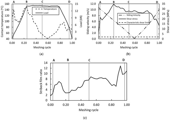 Operating conditions during a meshing cycle (A: initial approach, B: maximum Hertz pressure, C: pitch point, and D: onset of separation). (a) Contact load and temperature; (b) Sliding velocity and shear stress; (c) Stribeck film ratio.