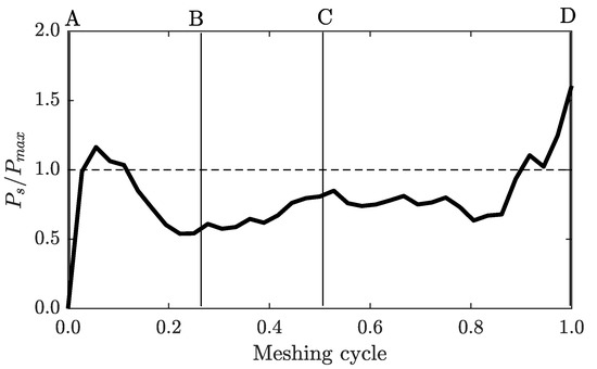The LLTCA approach is used to obtain the instantaneous contact geometry and sliding velocity of a pair of meshing involute teeth. A comprehensive description of LLTCA is provided by Oglieve et al. [35] and Sivayogan et al. [39]. Here, only a brief description is provided. Essentially, the surface geometry of the meshing teeth pairs is measured using a coordinate measuring machine (CMM) with a high measurement sensitivity of ±1.5 μm. This action enables the inclusion of realistic surface anomalies. Under steady-state conditions, cyclic meshing assumes that all the mating teeth pairs undergo the same normal loading and surface shear. Thus, to reduce the burden of computation, only 3 consecutive teeth pairs in a meshing cycle are measured. Finite element analysis is used to determine the contact mechanics (deformation) and kinematics (surface velocities) of contacting teeth flanks within a meshing cycle. This is the usual approach for the TCA of meshing teeth, as described in [36,37,38]. With LLTCA, the information obtained through TCA is supplemented by lubricated viscous friction. For the high-performance transmission, originally studied by Elisaus et al. [9] and the subject of the current analysis, high contact loads and traction lead to the non-Newtonian shear of the lubricant. Under these conditions, friction is obtained as:
