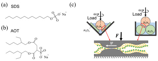 Sodium dodecyl sulfate (SDS) is one of the commonly used additives in water-based lubricants. As shown in Figure 1a, the SDS molecule is single-chained, with a critical micelle concentration (CMC) of 8 mM [30]. Zhang studied the relationship between the adsorption structure and COF [31]. Siqing and Liu applied different electrode potentials to the friction pair to control the adsorption/desorption of SDS and its tribological properties [32,33,34]. As another widely studied surfactant in aggregation and wetting, sodium bis (2–ethylhexyl) sulfosuccinate (Aerosol–OT, AOT) is double-chained, with the same number of carbon atoms in the main carbon chains as SDS, as shown in Figure 1b. AOT is more hydrophobic, with a CMC of only 2.5 mM [35], resulting in a strong aggregation and transport ability which means that it can sequentially form micelles, vesicles, and several phase structures as the concentration increases [35,36,37,38]. Furthermore, AOT vesicles exhibit a higher diffusion rate and adsorption strength to hydrophobic surfaces than SDS micelles [38,39,40]. However, AOT has not been investigated as a lubricant additive, probably due to the large-steric-hindrance molecular structure that makes it hard to form a dense adsorption layer. Therefore, comparative studies on the lubrication behaviors of SDS and AOT solutions could be carried out to explore the effects of molecular structure.