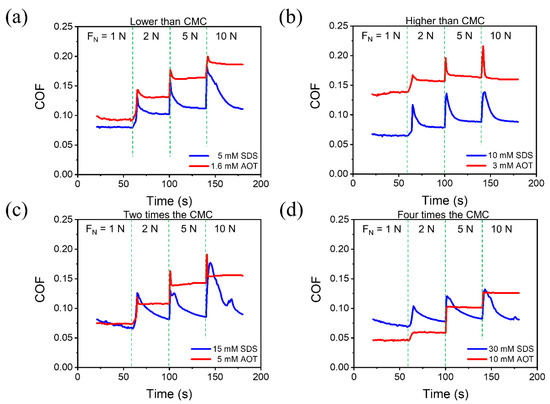 COF of the tests at 300 rpm (the sliding velocity was 0.141 m/s) and step-up load. The load was applied as FN = 1, 2, 5, and 10 N, respectively. Different concentrations of SDS and AOT solutions were used as lubricants, including the concentrations that were (a) lower than the CMC, (b) higher than the CMC, (c) about two times the CMC, and (d) about four times the CMC.