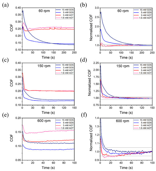 On the friction pairs that had been running in with DW under a load of 1 N, friction tests were carried out with a constant load of 1 N and different angular velocity, as shown in Figure 3. Different concentrations of SDS and AOT, lower than or about twice the CMC, were used as lubricants. Figure 3a,c,e shows the curves of COF over time under angular velocities of 60, 150, and 600 rpm, respectively. For a more intuitive comparison of the time required for the dynamic process, a normalized COF was obtained by dividing the COF by its stable value, shown in Figure 3b,d,f. The stable COF value was taken as the average value of the last 10 s of each experiment; thus, the normalized COF would eventually tend to 1. The gray lines in the figures represent the ±5% of the stable COF, between which the COF was considered stable. Furthermore, they enabled an intuitive comparison of the time required for the dynamic process. Similar conclusions to the above figures could be seen such that, under all system angular velocities, the COF of all concentrations of SDS experienced a slower and longer decrease until lower stable COF values were reached. The duration for 15 mM SDS was longer than that for 5 mM SDS. Moreover, the lower the velocity, the longer was the dynamic process.