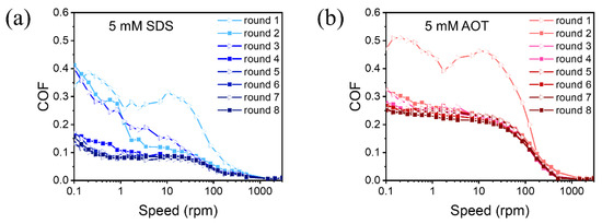 The Stribeck curves of 5 mM SDS and AOT were obtained in continuous variable speed experiments to characterize the lubrication state under various conditions, as shown in Figure 4. The applied load of the running-in and the subsequent friction tests was 2 N; varied from 0.1 to 3000 rpm. The friction lasted 3 s at each ω to avoid large differences in solid surface, and the COF was an average of 3 s. For both SDS and AOT, the COF in round 1 was higher than those in the other rounds. This was because the Si3N4 ball was lifted while changing lubricants (from DW to the surfactant solution) and was then placed at the measurement position again. Accordingly, the surfaces experienced a short running-in at the beginning of each experiment. The friction curves of SDS in rounds 2–4 did not coincide well, and the COF in the boundary lubrication region decreased significantly among the rounds until the COFs of rounds 5–8 were almost coincident. In contrast, the friction curves of AOT in rounds 2–8 all had a high coincidence degree. Thus, the dynamic process duration of SDS (rounds 1–4) was much longer than that of AOT (round 1). Moreover, in the dynamic process, COF varies more with speed in the boundary lubrication region than in the stable phase. Furthermore, the lubrication states in Figure 2 and Figure 3 were mixed lubrication, according to the stable Stribeck curves.