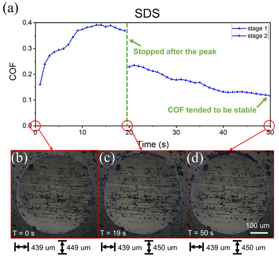 Friction curves with 5 mM SDS solution lubrication and wear scar at each stage. (a) Two stages of COF curves over time. Before stage 1, the friction pair had been running in with DW, and the wear scar was as shown in (b). (c,d) The wear scar after stage 1 and stage 2, respectively.