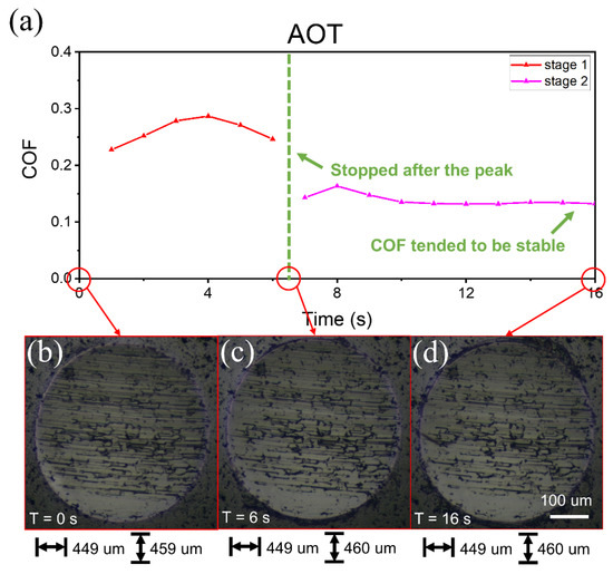 Friction curves with 5 mM AOT solution lubrication and wear scars at each stage. (a) Two stages of COF curves over time. The load and speed were the same as those of SDS. Before stage 1, the friction pair had been running in with DW, and the wear scar was as shown in (b). (c,d) The wear scar after stage 1 and stage 2, respectively.
