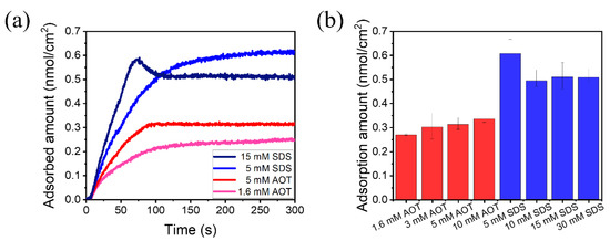 Adsorption of SDS and AOT solutions measured using QCM. (a) Typical scatterplot of the adsorbed molecular number per unit area varying with the introduction time of the liquid. (b) Statistical results of adsorption amount of different concentrations of SDS and AOT solutions.