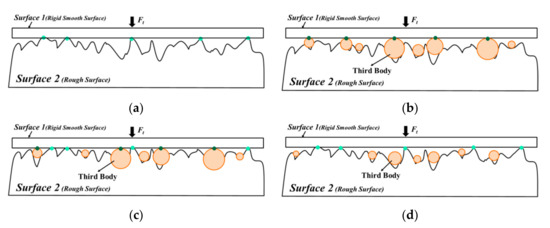When two rough surfaces are in contact with each other, this can be simplified into an equivalent rough surface and a flat surface (s-s 2-body contact) [40,41], as shown in Figure 1a. However, if third bodies exist at the contact interfaces, there will be three kinds of contact mode according to the relative values of the diameter of the third body to the separation of the two surfaces. In the first contact mode, namely 3-body particle-to-surface contact (3-body p-s contact), the diameter of the third body is much larger than the separation of the two surfaces. The particles completely separate the two surfaces. The normal contact load is borne by the contact points between the third bodies and the surface, as shown in Figure 1b. In the second contact mode, that is 3-body hybrid contact, the difference between the diameter of the third body and the separation between the two surfaces is small. The third bodies with surface and the two surface contact points share the normal contact load, as shown in Figure 1c. In the third contact mode, 3-body surface-to-surface contact (3-body s-s contact), the diameter of the third body is much smaller than the separation between the two surfaces and all the third bodies sink into the trough. The normal contact load is borne by the contact points of the two surfaces, as shown in Figure 1d.