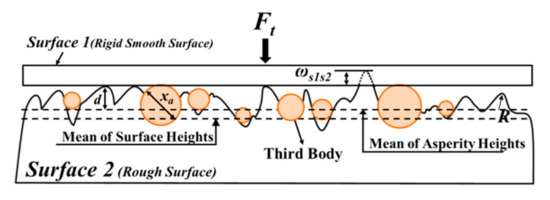 A schematic diagram of the interface of surface 1, surface 2, and third bodies in a 3-body contact system is shown in Figure 2, where xa is average diameter of the third body, ϕa(x) is probability density function of the third body diameter and Xmax is the maximum diameter of the third body. The 2-body microcontact model used in this study is the ZMC model. According to the 3-body microcontact model [26], the normal contact load Ft and total real contact area At are as follows: