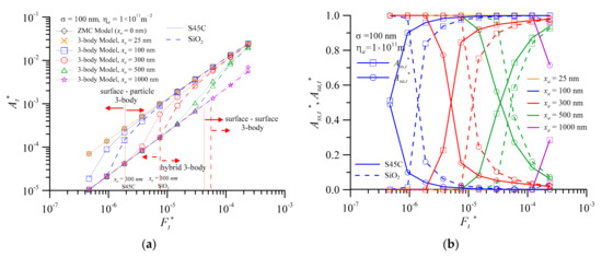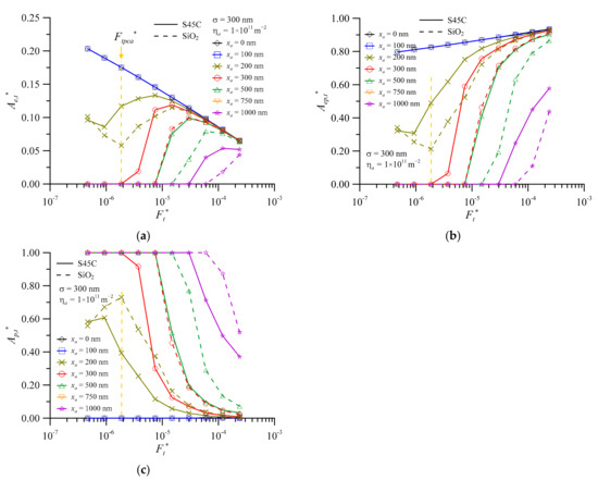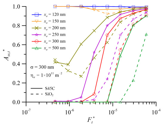 Figure 8 takes Ass,t* as an example to illustrate the difference between the two kinds of third body materials under the same conditions as shown in Figure 6b. At the same dimensionless normal contact load, because the hardness of SiO2 is relatively larger than that of S45C, the greater hardness will decrease the value of Ass,t*. When the third body is SiO2, the value of Ftpca* is larger than that of S45C. However, when xa/σ ≈ 0.5–0.7 and the dimensionless normal contact load is smaller, the value of Ass,t* of SiO2 is greater than that of S45C. This is because the hardness of SiO2 is greater, and the sinking amplitude of the third bodies is also greater. Therefore, when the third body is a foreign particle, the critical load of its interface from 3-body p-s contact mode to 3-body hybrid contact mode is greater than that of metal wear debris.