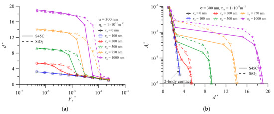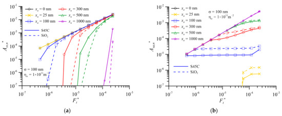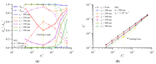 Two types of critical load were defined by the initial dimensionless normal contact load, as shown in Figure 3. The first critical load (Fcr1*) is defined by the initial dimensionless normal contact load of 3-body p-s contact shift into 3-body hybrid contact mode. The second critical load (Fcr2*) is defined by the initial dimensionless normal contact load of 3-body hybrid contact shift into 3-body s-s contact mode. For the same Ft*, the At* of SiO2 and S45C decreases with the increase in average third body diameter, as shown in Figure 3a. The At* of SiO2 is smaller than that of S45C for all dimensionless normal contact loads. These results indicate that the foreign particles (SiO2) cause the wear and contact temperature of the interface are higher than those for wear debris (S45C). The values of Fcr1* (2.0 × 106) and Fcr2* (4.0 × 105) for S45C with xa = 300 nm are smaller than those of foreign particles (SiO2), as shown in Figure 3b. Both values of Fcr1* and Fcr2* increase with the increase in the average diameter of the third body for the two materials. Furthermore, the value of Fcr1* of SiO2 is significantly larger than that of S45C. By contrast, the difference between the values of Fcr2* is not obvious for the same average third body diameter.