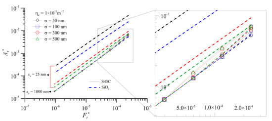 Figure 5 shows the dimensionless real contact area versus dimensionless normal contact load at various equivalent surface RMS roughness of xa = 25 nm and xa = 1000 nm, respectively. For the SiO2 with xa = 25 nm, the At* increases linearly with increase in Ft* for all equivalent surface RMS roughnesses. By contrast, the At* decreases with increase in equivalent surface RMS roughness for the same Ft*. For the same equivalent surface RMS roughness, the At* of S45C almost overlaps with that of SiO2. At this moment, the contact is within 3-body s-s contact mode. When the SiO2 with xa = 1000 nm and Ft* < 6.0 × 10−5, the At* increases linearly with the increase in Ft* for all equivalent surface RMS roughnesses. The At* almost overlaps for all different equivalent surface RMS roughnesses. For equivalent surface RMS roughness below 0.5 μm and average third body diameter of 1 μm, the contact is in 3-body p-s contact mode. At this time, the equivalent surface RMS roughness and third bodies have little effect on the dimensionless real contact area. When Ft* > 3.0 × 10−5, the rising rate of At* increases slightly, and the greater the equivalent surface RMS roughness, the greater the rise in At*. Moreover, the At* of S45C is greater than that of SiO2 by about 6.8–26.6%. In addition, the At* of xa = 25 nm and 1000 nm are almost parallel at the same equivalent surface RMS roughness as the dimensionless normal contact load increases when Ft* < 3.0 × 10−5, as shown in Figure 5. The gap of At* between xa = 25 nm and 1000 nm decreases with increase in equivalent surface RMS roughness. The gap of σ = 50 nm is about 9.8 times that of σ = 500 nm. This shows that when the equivalent surface RMS roughness gets smaller or the average third body diameter gets larger, the third body not only has a greater impact on the dimensionless real contact area, but is also more likely to cause unstable operation of the parts and surface damage. Therefore, the equivalent surface RMS roughness should not be as small as possible while conducting surface engineering design.