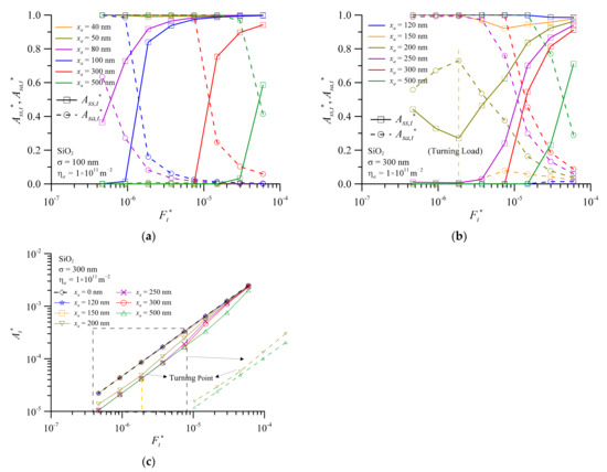 When the dimensionless normal contact load of turning point of contact area (Ftpca*) rises to 3.0 × 106, the curve of At* turns back to 3-body s-s contact mode (xa = 0 nm) from 3-body hybrid contact mode as the dimensionless normal contact load reduces, as shown in Figure 7b of xa = 300 nm. Similarly, the curve of xa = 150 nm in Figure 6b and the curve of xa = 250 nm in Figure 7a also return to the 3-body s-s contact mode only in the small recurve phenomenon. As shown in Figure 6 and Figure 7, this TPCA phenomenon is found for the SiO2 particle concentration of 1.0 × 1011 m2 and xa/σ ≈ 0.5–0.7. This result is similar to the experimental results obtained by Peña-Parás et al. [52] when the effect of reducing friction and wear was observed at xa/σ less than 0.7. Note that this ratio value is related to the material properties and operation conditions of the three bodies. This also shows that when nanoparticles are added to the lubricant under various operating conditions, the optimum wear and friction properties are obtained at the appropriate concentration and average third body diameter, rather than a higher average diameter being necessarily better [1,2,3,6]. Comparing Figure 3a, Figure 6c and Figure 7b, one can find that larger values of equivalent surface RMS roughness will result in a narrower area of relationship between the dimensionless real contact area and the dimensionless normal contact load under 3-body contact mode.