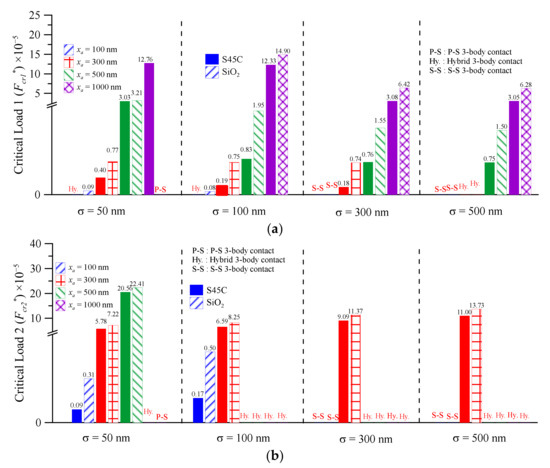 Figure 9 shows the critical load versus equivalent surface RMS roughness at various average third body diameters and third body material for first critical load (Fcr1*) and second critical load (Fcr2*). For SiO2 under the same equivalent surface RMS roughness, as shown in Figure 9a, the Fcr1* increases with increase in the average third body diameter. However, the value of Fcr1* decreases with increase in the equivalent surface RMS roughness at the same average third body diameter. The Fcr1* value of S45C is less than that of SiO2 at the same equivalent surface RMS roughness and average third body diameter. As shown in Figure 9a, SiO2 needs a larger dimensionless normal load to make the contact interface enter the 3-body hybrid contact mode. This indicates that SiO2 has a larger dimensionless normal load range in 3-body p-s contact mode than in the two other modes. For 3-body p-s contact mode, maintaining the contact pressure at the interface for a long period of time will easily exceed the pressure limit and cause surface damage. For SiO2 under the same equivalent surface RMS roughness, as shown in Figure 9b, the value of Fcr2* increases with increase in the average third body diameter. Conversely, the value of Fcr2* decreases with increase in the equivalent surface RMS roughness at the same average third body diameter. The Fcr2* value of SiO2 is larger than that of S45C under the same equivalent surface RMS roughness and average third body diameter. In addition, when xa = 100 nm, σ = 50 nm and σ = 100 nm, the Fcr2* value of SiO2 is about 2.9–3.4-fold larger than that of S45C. By contrast, for other average third body diameters under the same equivalent surface RMS roughness, the Fcr2* value of SiO2 is only about 1.1–1.3-fold larger than that of S45C. Therefore, the difference in Fcr2* between the metal wear debris and foreign particles is relatively insignificant. From Figure 3, Figure 4, Figure 5, Figure 6, Figure 7, Figure 8 and Figure 9, it can be found that the 2-body contact is an ideal contact mode at the contact interface. This is because its dimensionless real contact area is almost linear with the dimensionless normal contact load and it is easy to predict its changes under different operating conditions as shown in Figure 5. In fact, the actual contact interface is a 3-body contact system. It is not possible to maintain the ideal 2-body contact state. Although the dimensionless real contact area of the 3-body p-s contact mode is almost linear with the dimensionless normal contact load, as shown in Figure 5, the third bodies have completely separated the two surfaces. Consequently, this will cause the instability of the contact interface. The foreign particles are more likely to cause 3-body p-s contact mode at the contact interface than the wear debris. This indicates that environmental dust is more likely to cause excess wear or failure of the contact interface. Therefore, it is recommended to change the lubricating oil regularly and appropriately maintain the oil circulation system, so as to ensure the stability of the contact interface and increase the service life of the components. From the present analysis, it is necessary to constrain the ratio of average third body diameter to equivalent surface RMS roughness (xa/σ) to not exceed 0.7.