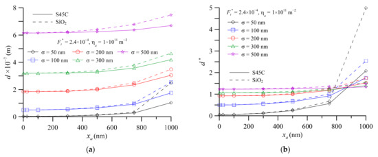 Under the same dimensionless normal contact load, Figure 11a,b show the separation between the surface 1 and mean height of asperities (d) and dimensionless separation (d* = d/σ) versus average third body diameters for various equivalent surface RMS roughnesses and third body materials, respectively. Figure 11a shows that the separation increases with increase in the equivalent surface RMS roughness and average third body diameters. For the same equivalent surface RMS roughness, the separation value of SiO2 is greater than that of S45C. Moreover, the disparity between SiO2 and S45C increases as the average third body diameter increases. Figure 11b, which shows dimensionless separation, illustrates the amplitude of change at various equivalent surface RMS roughnesses and average third body diameters. When the ratio value of average third body diameter to equivalent surface RMS roughness increases, the contact readily enters into 3-body p-s contact mode, as shown in Figure 9. Moreover, the change amplitude of dimensionless separation increases as well. For xa = 1000 nm, the dimensionless separation value of SiO2 is about 2.5 times larger than that of S45C. This confirms the importance of preventing foreign particles from entering the lubricated interface.