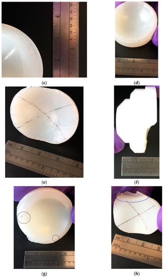 Complete fracture of the liner is caused by extensive propagation of wear transitioning to fatigue cracking propagating to critical size and unable to sustain the applied load. This may also occur due to overload due to high-stress events (from falls or terrain issues) in addition to malalignment secondary to aseptic loosing []. As damage infiltrates the inner layers of the UHMWPE, it eventually spans across the inner surface and spreads orthogonally in either direction. Continued loading and fatigue accelerate the fracture process and lead to the failure of the liner. One liner examined displayed complete fracture, causing separation into two pieces. This liner is detailed in Figure 1h. In total, complete fracture through the liner was noted in 17.4% of the liners.