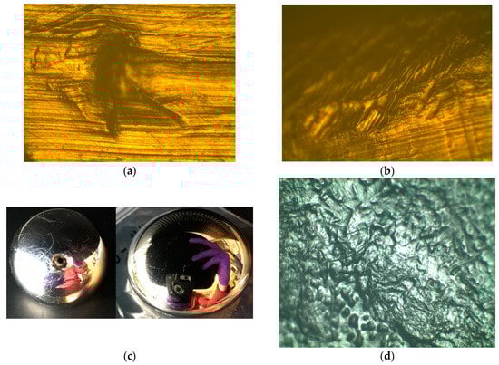 Another type of wear examined in scrutiny during stereomicroscopy was pitting corrosion. Pitting (Figure 5d) in polymer components is often associated with free-radical oxidation [,]. In the visual examination process, pitting was observed on 26.1% of the liners. Stereomicroscopy revealed insolated regions of pitting on liners that had not been previously found. These results are indicative of free-radical oxidation of the liner, leading to corrosion from oxygen acting as an anode within the UHMWPE. See Figure 4 for an example of pitting found in the liners.