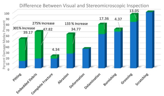 In this research, we were able to compare the visually observed damage features with those of stereomicroscopy. Figure 6 shows the corrected change in the tabulated wear data from the visual examination to stereomicroscopy. The percentage increase between examination methods is shown, as well as the physical percentage of liners where the damage was previously overlooked in Figure 6.