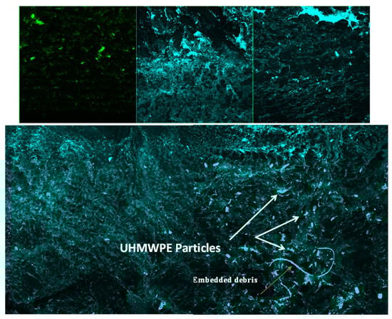 Nearly all wear modes were underrated during visual examination, and it was clear that microdamage was present throughout the articular surface that was not otherwise apparent in visual exam. Pitting was the most underrated form of damage physically occurring in 52.2% of the liners, followed by embedded debris occurring in 65.2% of the liners. The prevalence of pitting in over half the samples examined is indicative of free-radical oxidation, resulting in a decrease in physical strength from morphological changes in the microstructure. Similar results were obtained [], where 75 liners were examined and it was found that a majority of the liners had pitting present with an average damage score of 7.4, using evaluation methods defined by Hood et al. [,,,]. The corrected increase in embedded debris gives an origin to the amount of grooving and scratching present. Particles enter between the articulating surfaces of the joint and are dragged between the ball and liner in randomized motion as the joint is subjected to tension and compression. These particles can range from bone cement, liberated PMMA fragments, or metal fragments from the ball [].
