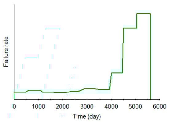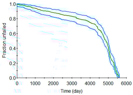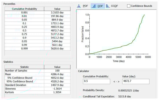 For this study, Goldsim Software Inc. (Seattle, WA, USA) provided an academic version of their program for free. This software has been used to model and predict device failure across many industrial and medical specialties. Goldsim Software uses ‘realizations’ in the form of a specified number of separate simulations that are conducted for a predetermined number of years. In this study, each realization represents a separate liner being simulated to failure. The results from each liner are tabulated and combined. The instances of failure due to each damage mode can then be reexamined individually. The liner simulation duration was defined through 22 years since manufacture so that all the liners could be seen out to failure. Scratching and grooving were defined as the Poisson process resulting in a wear rate of 1 × 10−5 per day and 5 × 10−5 per day, respectively. Delamination, pitting, abrasion, deformation, complete fracture, and embedded debris were defined with Weibull Mean-Life and Slope Factor. Where a Poisson process is considered to occur at a constant rate, Weibull Mean causes an event to occur around a specified time and then progresses to failure at a defined slope rate. Multiple simulations were run, adjusting the rate at which damage occurs for the results to resemble known failure statistics. The average duration to failure of the liners was 8035.5 days from 100 realizations. Table 4 shows the average operational availability of the liners at 5% and 95% confidence bounds. Figure 10 represents the projected failure curve of the liners with respect to time. Figure 11 and Figure 12 are the results as a probability distribution and complementary cumulative distribution [,].