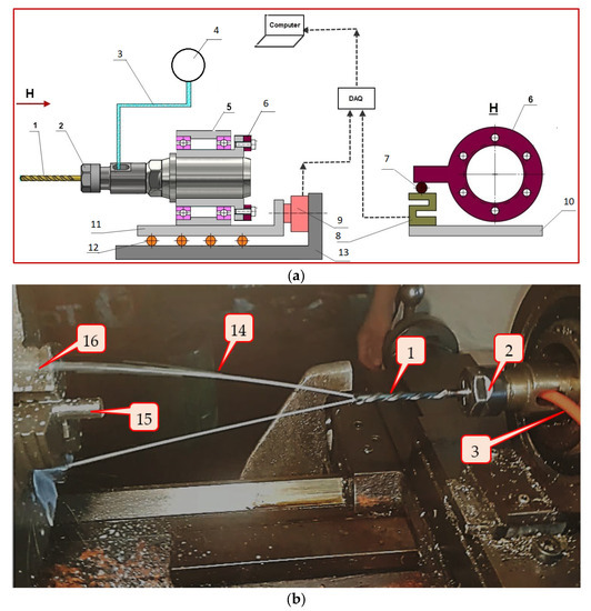 In Figure 1, the drill bit (1) was clamped inside a collet (2). The cover of the collet has a slot as a door so that a plastic tube (3) can go through to provide the coolant into the drill bit. The drill bit was nested in the plastic tube first, and then the tube was threaded through the slot. A small pump (4), employing a commercial windshield washer pump for automobiles, provided a pressure of 1.5 bars and a flow rate of 0.25 L/min through the two internal holes of the drill bit. The pump was supplied by a 12 V DC voltage with a consumption power of 24 W. The collet body was supported by two bearings placed inside a sleeve (5), providing a rotational ability. A load cell (8) was used to constrain such rotation trend via a disk (6). The signal from that load cell gave the total torque induced in the drilling process. The features were fixed on a sliding bearing (11,12) where the sliding ability was constrained by another load cell (9). The fixture body (13) was fixed on the tool post of the lathe. The workpiece (15) was clamped inside the three-jaw chuck (16) of the lathe. As can be seen from the photograph taken in Figure 1b, the coolant fluid (14) was being provided through the tool bit.