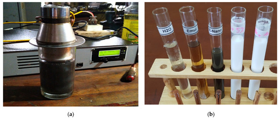 The nano-fluid preparation: (a) ultrasonic vibration to disperse nano sheets into emulsion oil and (b) the final fluids after 24 h since the mixing was completed.