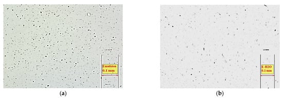 In the second step, the nano-emulsion was then stirred with normal tap water. As the emulsion was soluble into the water, the final lubricant fluid can be easily made with a little care of the proportion of each content as preferred. A scale of 10% emulsion and 90% water as a typical proportion, recommended by manufacturers, was used in this study. The 5% emulsion fluid was made for reference only. It was revealed that the nano particle was not clearly observed in the micrograph of the mixed fluid at 5% emulsion. In order to check if the nanosheets were completely dispersed into the fluid, micrographs of the fluids were taken at 24 h after the mixing was completed, as shown in Figure 3, using an Insize microscope with a scale of 100×. As can be seen in Figure 3a, the nanosheets scattered successfully in the base emulsion. The micrograph of the final nano-fluid made of water (90%) and nano-emulsion (10%) was shown in Figure 3b. As can be seen, the nanosheets appeared in dark dots reflecting that their distribution into the fluid was successful and without agglomerations, even at 24 h after mixing.