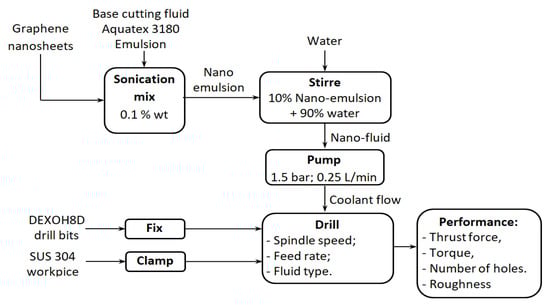 The emission preparation and drilling experiment processes are summarized in the schematic chart in Figure 4. In this study, the nano fluid mixed from nano-emulsion 0.1% wt and tap water with the scale of 10% in volume was applied as the nano-fluid-emulsion (FE) lubricant.
