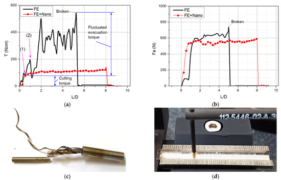 Looking at the torque and the thrust force, Figure 5a,b illustrates such signals obtained at the spindle speed of 550 rpm and feed rate of 0.07 mm/rev under the two lubricant media, with respect to the length-to-diameter ratio (L/D). The broken drill bit stuck inside the workpiece under FE lubricant is shown in Figure 5c, whereas a completed hole under FE+Nano lubricant is represented in Figure 5d for reference.