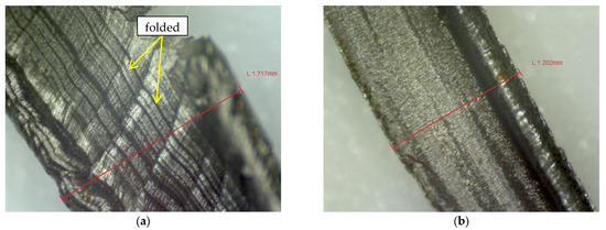 The effect of nanoparticles on reducing the friction induced in chip evacuation can be found in the chip images. In Figure 6, two micromorphology photographs of the chips induced under FE and FE+Nano lubricants are presented, respectively. As can be seen in Figure 6a, the chip induced under the typical emulsion lubricant (FE) has a surface topology of many large folds of the metal fibers, reflecting the high friction acting on the chip, preventing its evacuation. In contrast, the chip of FE+Nano shown in Figure 6b has a much finer topology, and the folds are almost invisible. This phenomenon also reflects the outstanding effect on chip evacuation of the nano particle added into the FE+Nano lubricant. Additionally, it was interesting to observe that the width of the chip induced from FE+Nano was smaller compared to that of the chip from FE. This would be the effect of larger friction preventing the chip evacuation in FE, resulting in more compressive chips in FE compared to those in FE+Nano. Further study for mathematical calculation and validation should be made to carefully examine these phenomena.