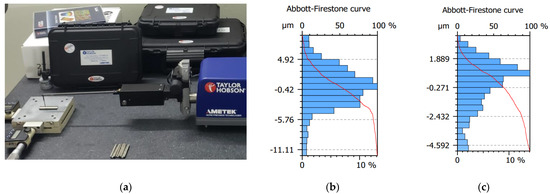 The outstanding effects of nano-lubricants on the chip evacuation would also improve the surface roughness of the drilled holes. In order to check these influences, the roughness of the holes made under FE and FE+Nano were measured by a Taylor Hobson device, as shown in Figure 7a. Each drilled workpiece was axially sliced into two identical parts and then the roughness average values were obtained (see the measurement setup in Figure 5b). The roughness distribution of the holes induced under FE and FE+Nano are represented in Figure 7b,c, respectively. The results revealed that the drilling using FE+Nano lubricant induced better holes, with an average roughness of about 1.465 µm, compared that of 2.819 µm from typical FE lubricant.