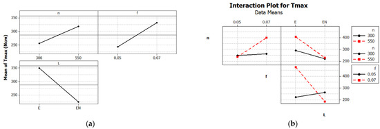 The main effect plot is used in conjunction with an analysis of variance and design of experiments to examine differences among level means of the maximum torque (Tmax) for three factors, including the Lubricant (L), spindle speed (n), and feed rate (f). Generally, a main effect is present when different levels of a factor affect the response Tmax differently. As can be seen in Figure 8a, all three factors, the lubricant, the spindle speed, and the feed rate, have significant effects on the response Tmax. Here, the largest effect came from the lubricant method, then the feed rate, and finally, the spindle speed. Regarding the lubricant supplying, the Emulsion-Nano (EN) significantly dropped down the response Tmax with respects to the emulsion lubricant. Besides, increasing spindle speed and feed rate both resulted in producing maximum torque.