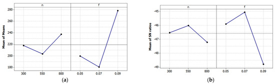 Taguchi experimental results: (a) the mean values and (b) the S/N ratios.