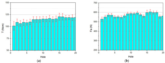 In this test, the multi-hole drilling was applied with the cutting parameters selected above, i.e., with n = 550 rpm and f = 0.07 mm/rev under the internal lubricant of nano-emulsion. The experimental results revealed that using one drill bit can successfully complete as many as 20 holes. Figure 10 represents the drilling torque and thrust force induced in drilling each hole.