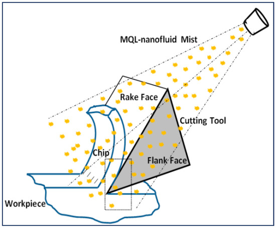 The increased performance of the NMQL cooling strategy can be attributed to two factors: an increased thermal conductivity of the base oil due to the addition of highly conductive nanoparticles, which resulted in an increased heat removal rate and reduced friction induced by the rolling effect of nanoparticles at the tool–chip interface. The increased nanoparticle concentration developed a thick protective layer on the tool and work surface [16]. The reduction in friction was achieved by reducing the contact between the tool and the workpiece. An exaggerated view of the tool–chip contact interface in an NMQL cooling process is shown in Figure 1. The nanoparticles in the base oil produce a rolling effect and thereby increase the sliding action of the tool, therefore reducing the friction. The highlighted studies clearly indicate a positive effect of using the NMQL cooling strategy. From Table 1 and an existing review paper [24] on NMQL machining, the most frequently used nanoparticles are tungsten disulfide (WS2), molybdenum disulfide (MoS2), boron nitride (BNNT and hBN), carbon nanotubes (CNT, SWCNT and MWCNT) and oxides of zinc (ZnO) and aluminum (AL2O3).
