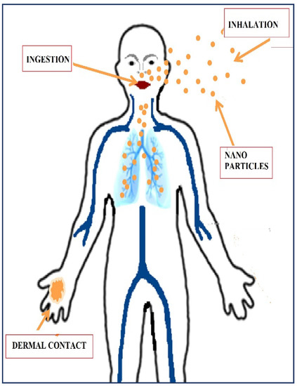 The significance of reducing the amount of lubricant used gave rise to the implementation of MQL techniques, which were then further developed into nano-minimum quantity lubrication. As shown in Table 1, many studies in the literature reflect the positive impacts of introducing nanoparticles in the base oil of a minimum quantity lubrication system. However, the toxicology of the nanoparticles must be understood in order to completely address the sustainability aspect of the machining process with NMQL. Nanoparticles are used in various applications and depending on their usage; nanoparticles may enter the human system by inhalation, oral intake or dermal contact [28,29], as shown in Figure 2.