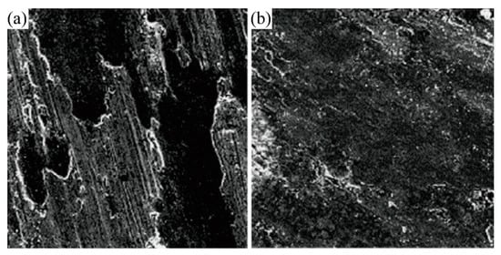 Morphologies of worn surface of the cermets infiltrated with and without Ag lubricant at p = 50 N and T = 800 °C. (a) without Ag lubricant added; (b) Ag-infiltrated. Reproduced with permission from Reference [47], Copyright © Elsevier B.V. 2006.