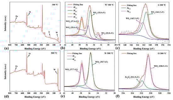 Elemental distribution at (a) 100 °C and (d) 500 °C. XPS spectra of W 4f at (b) 100 °C and (e) 500 °C, S 2p at (c) 100 °C, and O 1s at (f) 500 °C. Reproduced with permission from Reference [82], Copyright © Springer Science Business Media, LLC, part of Springer Nature 2020.