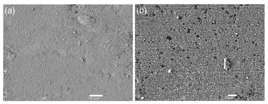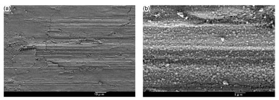 Au and Ag lubricants can be incorporated into high-temperature intermetallic or ceramic matrix composites/coatings for providing lubrication from room temperature to 600 °C [3]. They have high diffusion coefficients, which help the easy formation of lubrication films onto the surfaces of intermetallic or ceramic matrix composites, which are used to lubricate bearings, seals, and fasteners in sliding or rolling contact, and exhibit good thermochemical stability up to elevated temperatures [5]. Figure 1 shows the worn surfaces of the cermets infiltrated with and without Ag lubricant. The Ag-infiltrated cermet exhibited a thin lubricating film on the surface; however, obvious furrow marks were observed on the unmodified cermet. Friction heat and surrounding temperature induce the formation of a melting film, which can effectively reduce the friction coefficient [47]. Typical examples of Au- and Ag-containing coatings for tribological applications under the harshest conditions are YSZ/Au/MoS2/DLC, YSZ/Ag/Mo, and Al2O3/DLC/Au/MoS2 nanocomposite films fabricated by hybrid magnetron sputtering and pulsed laser deposition processes. All these films have friction coefficients of 0.1–0.4 for from 5000 to 10,000 cycles at 500 °C due to the migration of easy-to-shear noble metals to the surface to provide a lubricious layer [3,43,48,49].