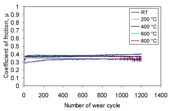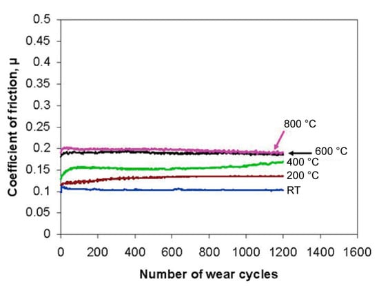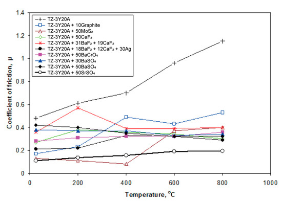 Chemically stable fluorides, such as CaF2, BaF2, and their binary eutectic combinations, are lubricious to reduce friction and wear from about 400 to 900 °C; however, they exhibit poor tribological behavior at low to moderate temperatures [1,11]. CaF2, BaF2, and BaF2-CaF2 eutectics have melting points of 1418 °C, 1353 °C, and 1022 °C, respectively. The lubrication mechanism of alkaline earth fluorides and eutectics depends upon a marked softening effect occurring at temperatures close to 500 °C due to a brittle-to-ductile transition [1]. Alkaline earth fluorides and eutectics are widely used as solid lubricants in metallic and ceramic matrix composites in industrial applications such as advanced engines due to their high chemical and thermal stability.