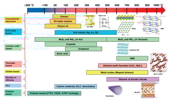 In the literature survey of solid lubricants and self-lubricating materials/coatings, the following classes of compounds are generally considered: polymer composites, soft metals, layered materials (graphite, hexagonal boron nitride, and transition metal dichalcogenides), alkaline earth fluorides, binary oxides (PbO, B2O3, Magneli phases TiO2, V2O5, and MoO3), and multi-component oxides (molybdates, tungstates, vanadates, tantalates, chromates, sulfates, silicates), oxythiomolybdates, MAX phases (Ti3SiC2, Ti2AlC, etc.) [1,2,6,7,8,13,14].
