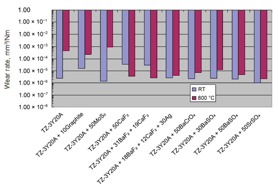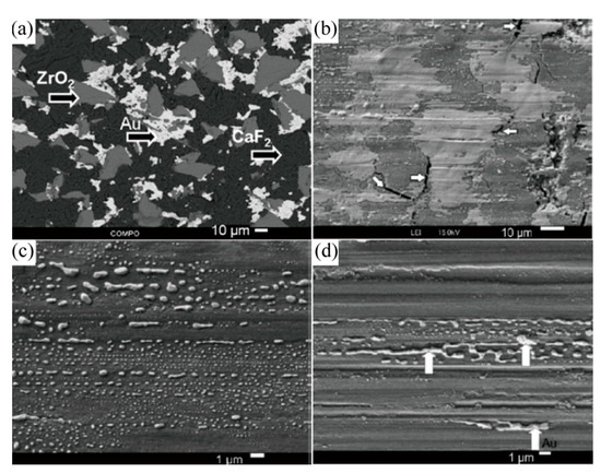 ZrO2(Y2O3) matrix composites incorporated with BaF2-CaF2 eutectic exhibited good friction and wear properties only above 400 °C when tested in dry sliding against alumina ball in a test temperature range from 25 to 800 °C [101]. In order to generate good self-lubricity from room temperature to about 400 °C, soft noble metals of Au or Ag were added into ZrO2(Y2O3)-CaF2 composites, which finally exhibited low friction coefficients and small wear rates in the order of 10−6 mm3/(Nm) from room temperature to 800 °C [102,103].