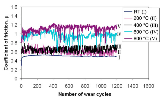 Substoichiometric compounds of certain transition metallic oxides (e.g., MenO2n−1, MenO3n−1, or MenO3n−2) contain planar lattice faults, which may result in crystallographic shear planes with reduced binding strength. Interestingly, Magneli phases such as TiOx, VOx, MoOx, and WOx deform by plastic flow rather than by brittle fracture at elevated temperatures [108]. Vanadium-based Magneli phases were verified to possess good self-lubricity in the industrial applications of high-temperature hard nitride coatings up to 700 °C [31]. The friction coefficients are reduced distinctly when these hard coatings were tested from 100 °C to 700 °C until the melting of the V2O5 phase at about 690 °C [109,110]. Hard nitrides or carbides containing W or Mo elements exhibit improved high-temperature tribological properties due to the formation of lubricious Magneli phases such as binary WOx and MoOx or multi-component oxides in the sliding contact [111,112]. A variety of binary metallic oxide coatings and their combinations provide solid lubrication at elevated temperatures, but the repeatability and sustainability of solid lubrication are still unknown under long-term thermal cycling conditions. Atomic layer deposited zinc titanate (ZnTiO3) coatings after annealing exhibited a friction coefficient of only 0.12 and a small wear rate of 1 × 10−7 mm3/(Nm) in unidirectional sliding against stationary Si3N4 ball, which is potential candidates for high-temperature solid lubrication in moving mechanical assembles up to 550 °C [28].